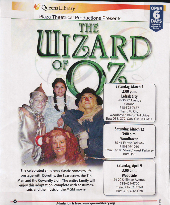 March 5, 2016 a musical performance "The Wizard of Oz", free for all customers at Lefrak City Library